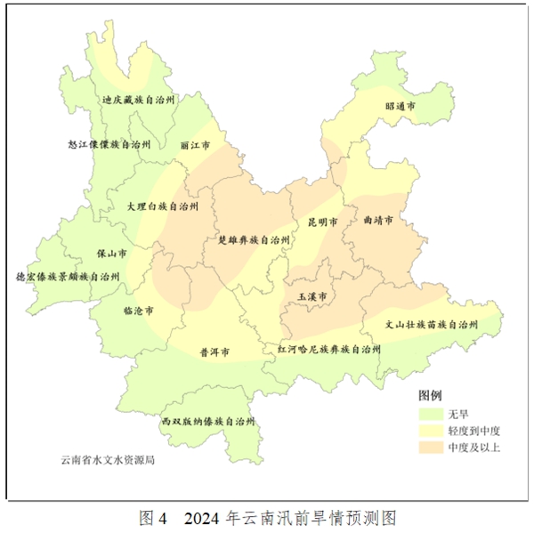 汛前尤其是4月至5月全省大部旱情偏重。據(jù)水文部門預(yù)測(cè),預(yù)計(jì)1月至5月全省主要江河來水整體偏少,全省部分中小河流可能斷流,汛前昆明市主城區(qū)、玉溪市紅塔區(qū)、楚雄州楚雄市、臨滄市臨翔區(qū)存在較大供水壓力。滇中大部、滇東北大部、滇東大部、滇西北東部和北部、滇西東部、滇南北部發(fā)生輕度至中度干旱的可能性較大,其中曲靖市中南部、文山州北部、紅河州北部、玉溪市東部、昆明市東南部和北部、昭通市西南部、楚雄州大部、普洱市北部、臨滄市東北部、大理州東南部、麗江市南部以及金沙江、紅河、瀾滄江干熱河谷地區(qū)可能發(fā)生中度及以上干旱(見圖4),抗旱形勢(shì)嚴(yán)峻。建議:密切監(jiān)測(cè)旱情動(dòng)態(tài),提前謀劃做好抗旱減災(zāi)準(zhǔn)備,提高抗旱保供能力,確保生活生產(chǎn)生態(tài)用水安全。