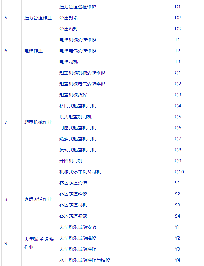 特種設(shè)備安全管理人員、叉車司機、起重機司機、起重機指揮、壓力容器、鍋爐、氣瓶充裝、電梯安裝與維修、觀光車、客運索道操作與修理、大型游樂設(shè)施操作與維修等等。