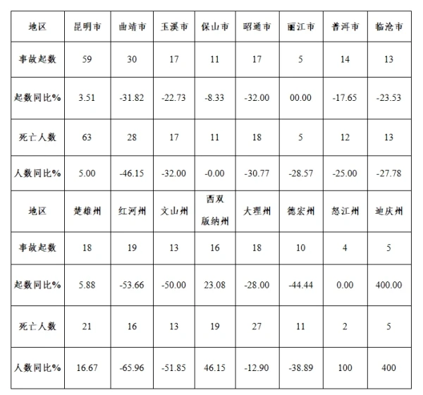 較大事故:昆明市1起、死亡3人,同比持平;西雙版納州1起、死亡3人,同比增加1起、3人;大理州1起、同比持平,死亡8人、同比增加4人。