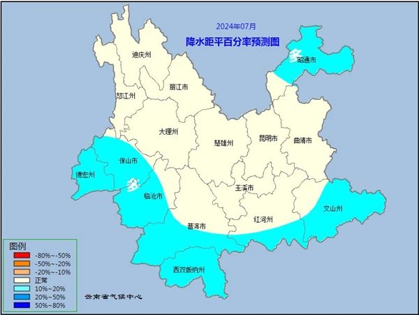 降水。德宏州、保山市、臨滄市西部、普洱市南部、西雙版納州、紅河州南部、文山州南部、昭通市偏多10%~20%,其余地區(qū)接近常年。(圖1)