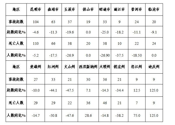 較大事故:昆明市2起、同比持平,死亡6人、同比減少1人;昭通市2起、同比增加1起,死亡6人、同比持平;西雙版納州2起、死亡6人,同比凈增加2起、6人;臨滄市1起、死亡3人,同比凈增加1起、3人;大理州1起、同比減少1起,死亡8人、同比增加1人。