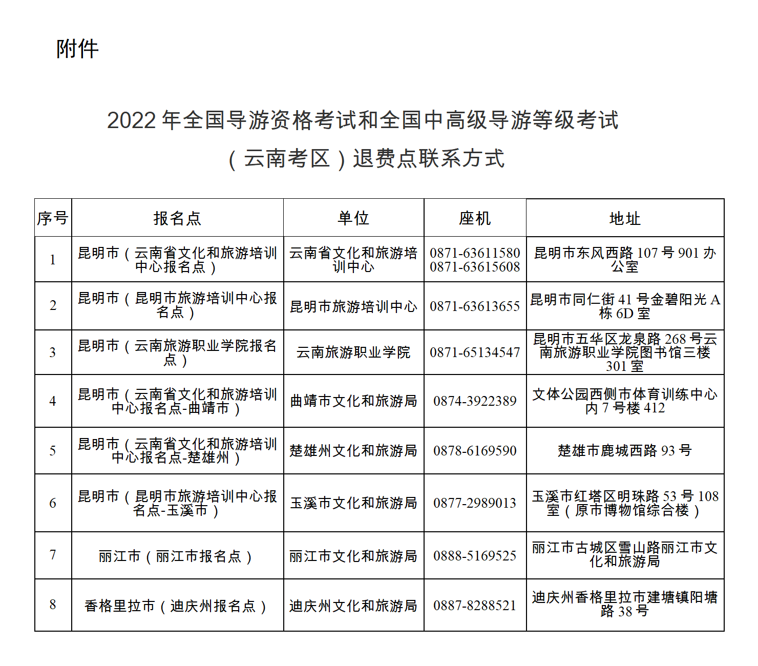 附件:2022年全國導游資格考試和全國中高級導游等級考試(云南考區(qū))退費點聯(lián)系方式