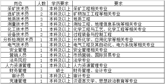 專業(yè)技術(shù)管理人才結(jié)構(gòu):采礦、礦物加工、資源勘查、測量、機(jī)械工程及其自動化、過程裝備與控制、電氣、儀表、自動化、企業(yè)管理、會計或財務(wù)管理、市場營銷、法律……等。