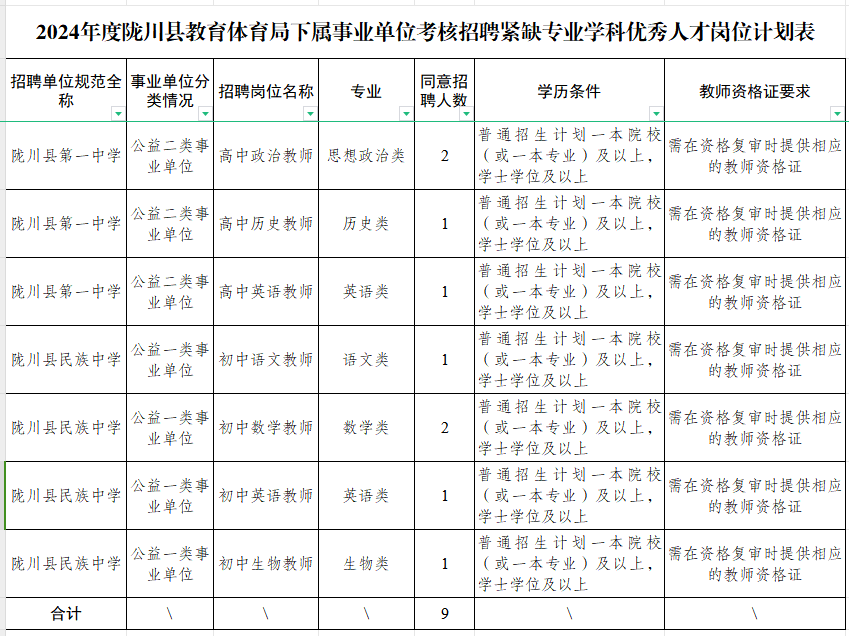 根據(jù)《關(guān)于同意縣教育體育局黨組使用編制通知單》(隴機編辦準[2023]4號)及《隴川縣人力資源和社會保障局關(guān)于印發(fā)2024年教育衛(wèi)生部門考核招聘緊缺專業(yè)學(xué)科優(yōu)秀人才工作方案的通知》隴人社發(fā)〔2024〕2號文件精神,2024年隴川縣教體系統(tǒng)考核招聘緊缺專業(yè)學(xué)科優(yōu)秀人才9名,其中:隴川縣第一中學(xué)4名、隴川縣民族中學(xué)5名,F(xiàn)將有關(guān)事宜公告如下: