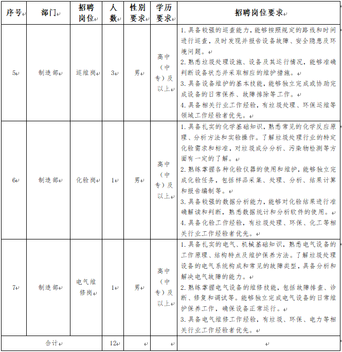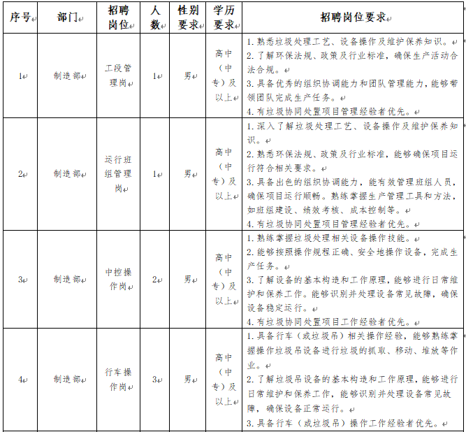 3.身體條件:身體健康,無恐高、高血壓等不適合一線生產崗位工作的疾病,具備一定的體力和耐力,能夠適應垃圾處理現(xiàn)場的工作環(huán)境。