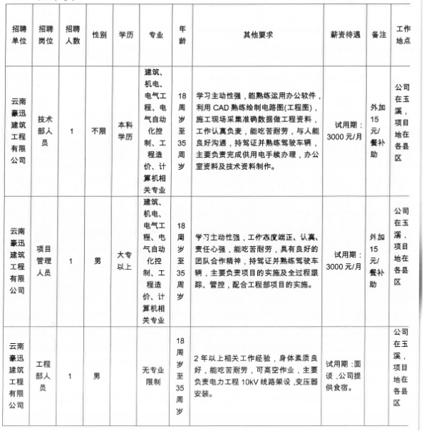 云南豪迅建筑工程有限公司因工作需要,委托澄江市啟澄人力資源有限責(zé)任公司,面向社會公開招聘技術(shù)工作人員3名,現(xiàn)將有關(guān)事項公告如下: