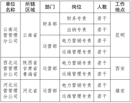 根據(jù)業(yè)務(wù)發(fā)展需要,現(xiàn)面向社會(huì)(包括中電工程本部及所屬企業(yè))開展開發(fā)投資公司云南、西北、河北運(yùn)營管理分公司相關(guān)崗位招聘工作,具體招聘事項(xiàng)公告如下: