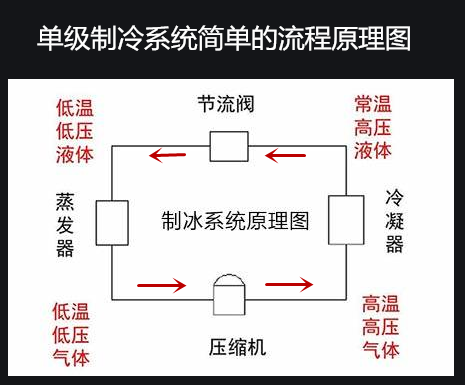 蒸汽壓縮式的冷庫制冷系統(tǒng)的流程原理,仍是大家熟悉的四大過程,即:壓縮——冷凝——節(jié)流——蒸發(fā)。相應的配套的主要設備是制冷壓縮機,冷凝器(風冷式或水冷式),節(jié)流閥(氟制冷系統(tǒng)為熱力膨脹閥),蒸發(fā)器(冷庫常用的為直冷排管和風冷式風機)。